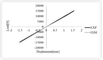 Holkin jäykkyyskäyrää (voima-siirtymäkäyrä) verrataan kokeellisiin tuloksiin, mikä edelleen todistaa vakiintuneen FEM-mallin pätevyyden. Kuten kuvasta voidaan nähdä: analyysi, jossa käytetään materiaalitestinäytteistä tunnistettuja hyperelastisia parametreja, osoittaa hyvän johdonmukaisuuden kokeellisten ja analyyttisten tulosten välillä kuorma-siirtymäkaaviossa.