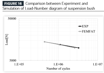 Seuraavaksi yllä olevan rakenneanalyysin tulokset siirretään ohjelmiston väsymisanalyysimoduuliin (tässä tapauksessa Magna ECS:n FEMFAT-ohjelmistolla) ja verrataan kestävyystestituloksiin. Testi ja analyysi osoittavat erinomaisen yhtenäisyyden sekä väsymisiässä että halkeamien sijainnissa.
