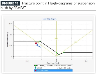 Haighin kaavio jousitusholkin väsymissimulaatiotuloksista paljastaa murtuman puristusjännityssuhteissa. Vaikka kumimateriaaliin kohdistuu yhtä paljon veto- ja puristuskuormia, analyysi osoittaa, että vika alkaa lopulta puristuksen alaisena.