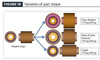 [Tehokkaan ajoneuvon tuotesuunnitteluprosessin luominen väsymisanalyysitekniikan avulla] Sovellettaessa ehdotettua väsymisanalyysitekniikkaa tärinää eristäville kumikomponenteille suoritettiin parametrinen tutkimus samasta materiaalista valmistetuille komponenteille geometrisen vaihtelun (kumin tilavuuden) ja kestävyyden välisen suhteen tutkimiseksi. Komponenttien geometria johdettiin alkuperäisestä osan suunnittelusta mallinnetuilla muunnelmilla, mukaan lukien: