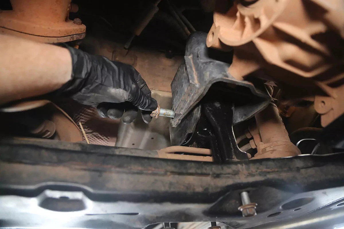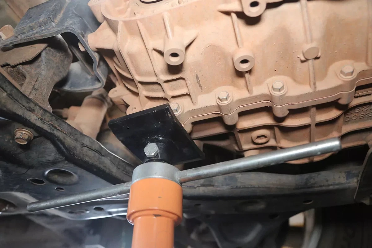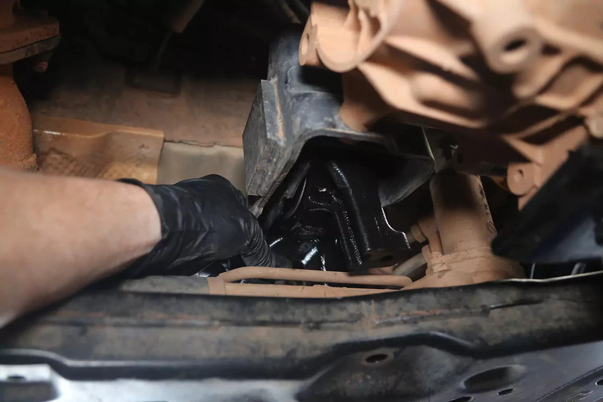 FWD-demoajoneuvossamme vaihteiston kiinnitys sijaitsee vaihteiston takana etuapurungossa. Jos sinulla on AWD-, 4WD- tai RWD-ajoneuvo, kiinnike on luultavasti vaihteiston takaosassa, keskellä melkein suoraan auton alla, vaihteiston ja poikkipalkin välissä.