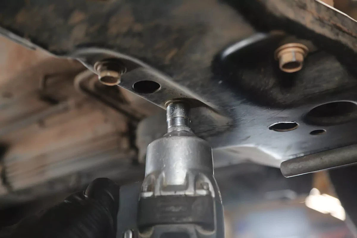 Demoajoneuvossamme telineessä on kolme pulttia apurungossa ja yksi pultti vaihteistoon. Neljä muuta pulttia kiinnittävät vaihteiston kiinnityskannattimen vaihteistoon. Useimmissa ajoneuvoissa näitä ei tarvitse poistaa.