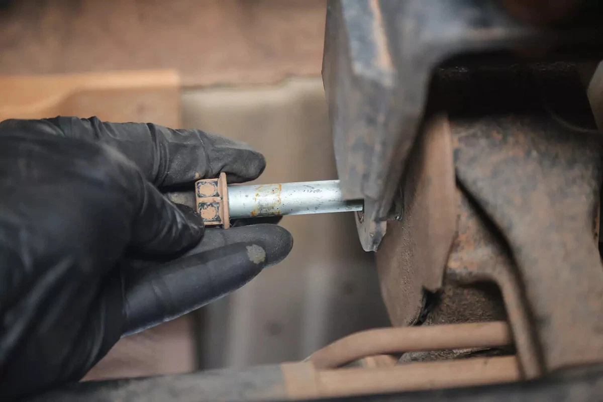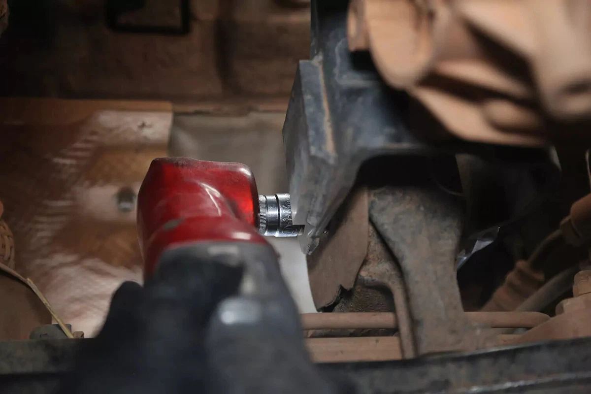 Demoajoneuvossamme on poikkipultti, joka irrotetaan toiselta puolelta avaimella ja toiselta hylsyllä. Näitä voi olla vaikea poistaa ahtaissa tiloissa. Käytä jarrutankoa, iskuavainta tai huijaritankoa saadaksesi tarvittavan vipuvoiman.